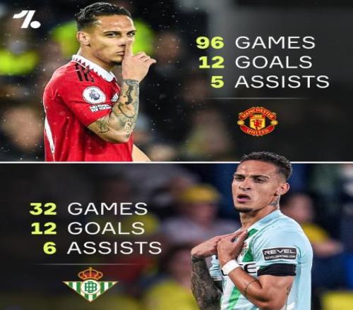 安东尼在皇家贝蒂斯32场参与18球,已超过曼联生涯96场的数据
