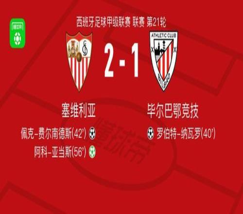 北京时间1月25日,西班牙足球甲级联赛第21轮,塞维利亚主场对阵毕尔巴鄂竞技。罗伯特-纳瓦罗率先破门,随后佩克-费尔南德斯破门扳平比分,阿科-亚当斯主罚点球命中完成反超。最终塞维利亚以2比1战胜毕尔巴鄂竞技。